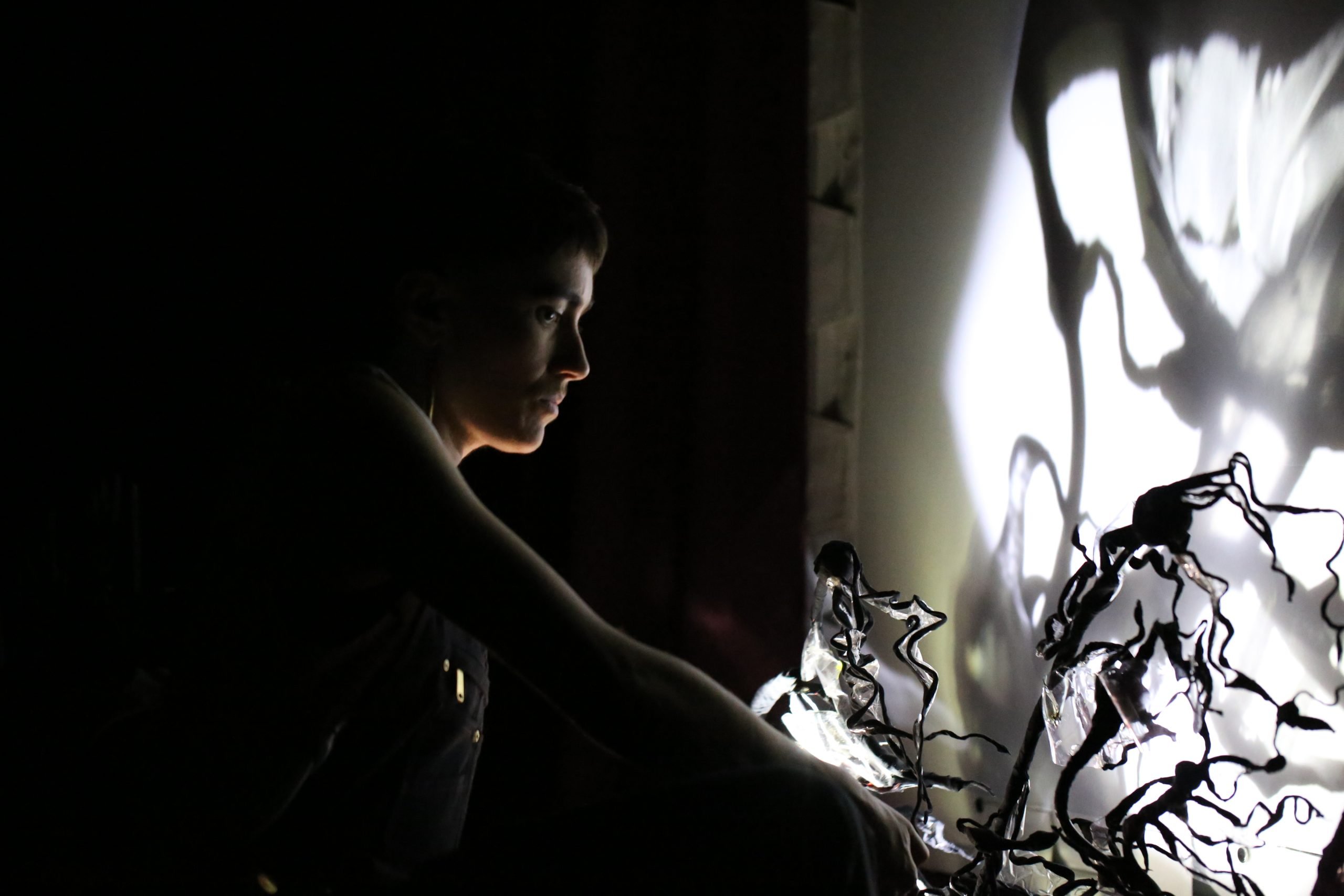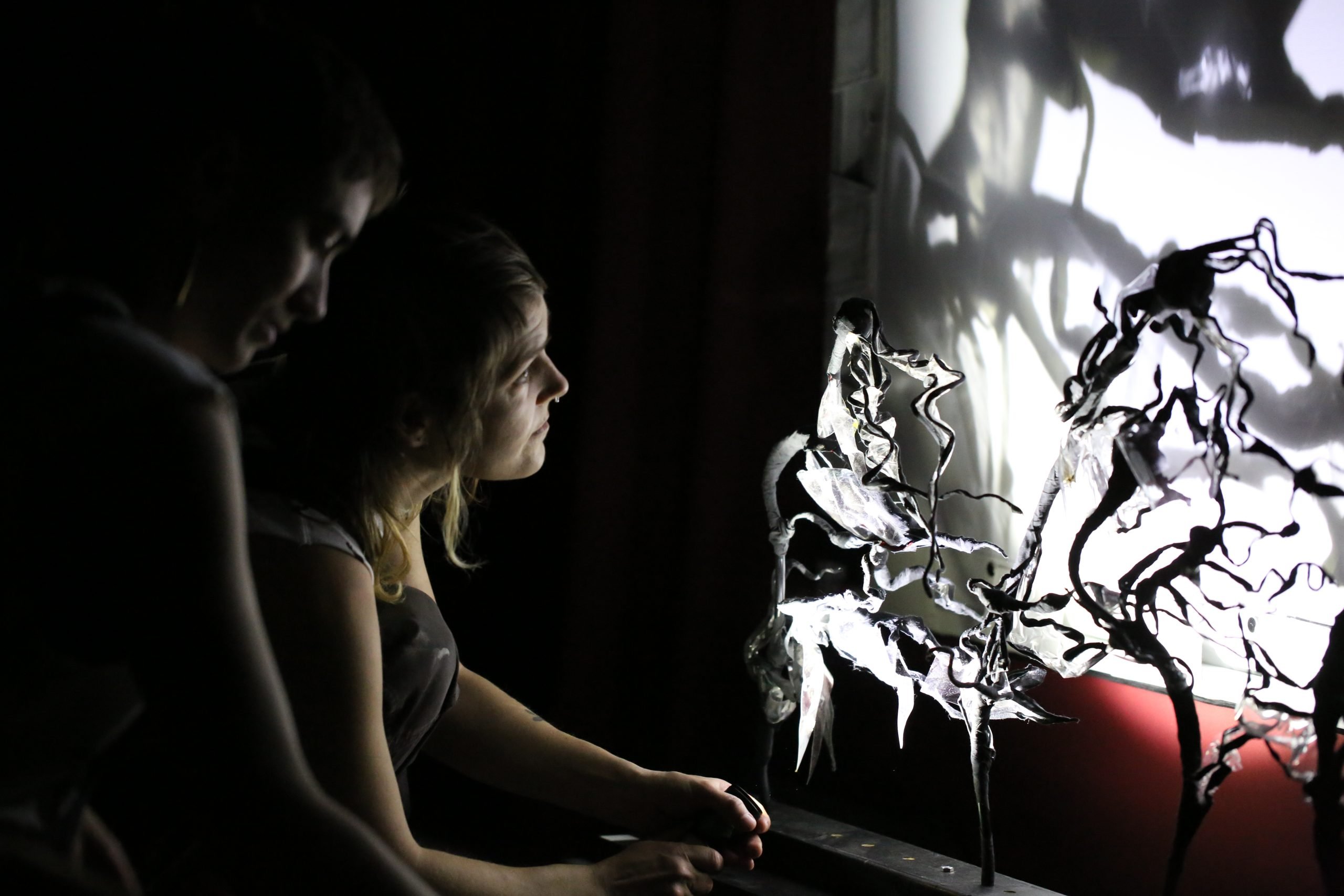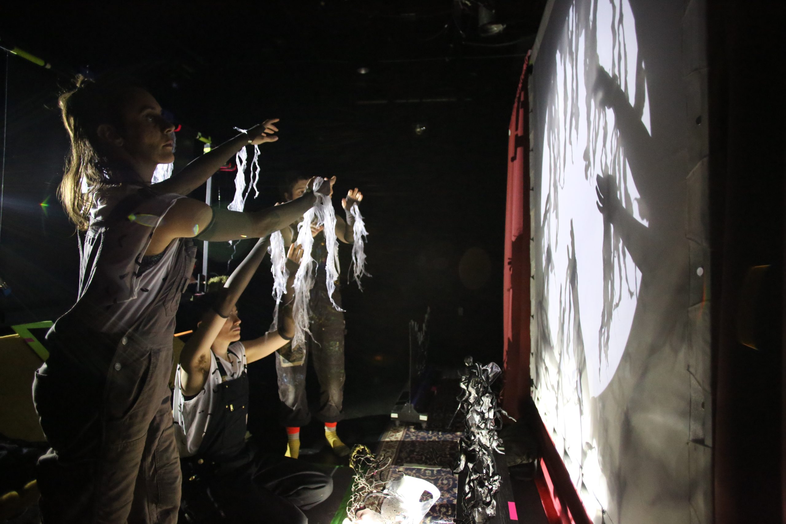Ocean Kin, created by Jeighk Koyote, is a 45-minute long poetic shadow show contemplating our relationship to body and self inspired by the ecology of the sea otter. Three performers animate plexi-glass puppets, 3D sculptural props and projected illustrations behind a screen using flashlights and an overhead projector that is both mechanically complex and visually rich. The performance carries a loose narrative through words and an ethereal soundscape created by Halifax musician, Alyson Randles.
